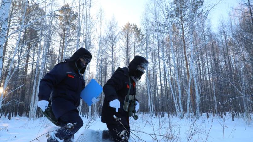 当天,漠河市最低气温零下30多摄氏度。比起居住区,空旷的野外,温度似乎要更低一些。耳际冷风呼啸,一番跋涉后,王少亭、马国军的帽子、睫毛、围脖上已经挂满“霜花”,呼吸之间,嘴里冒出一股股“白烟”。